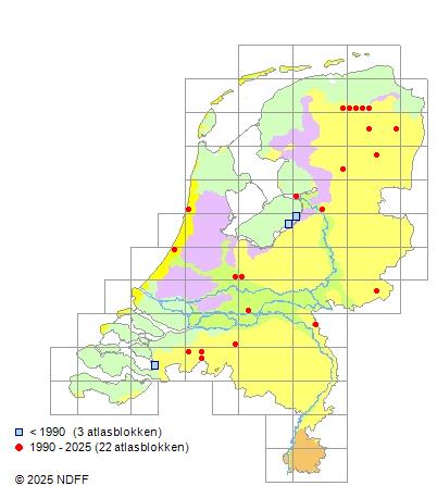 Het aantal atlasblokken (5x5 km) waarin de soort is gemeld binnen een periode van vijf jaar (vanaf 1980) of twintig jaar. Niet gecorrigeerd voor waarnemersinspanning en het aantal doorgegeven waarnemingen kan sterk variëren per periode, dus een trend in verspreiding kan hier niet direct uit worden afgelezen. Het opgegeven jaartal is het eerste jaar van de periode. Bron: gevalideerde waarnemingen uit de NDFF.