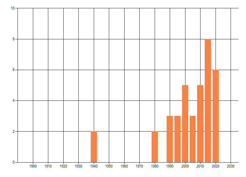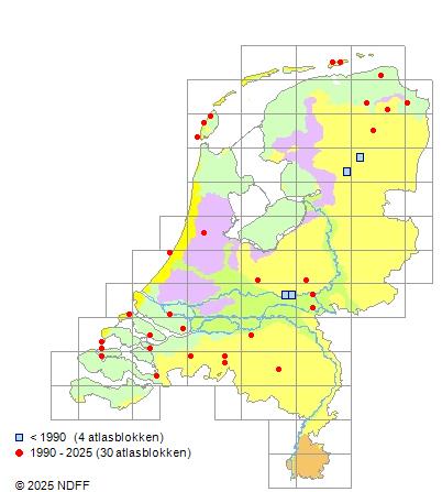 Het aantal atlasblokken (5x5 km) waarin de soort is gemeld binnen een periode van vijf jaar (vanaf 1980) of twintig jaar. Niet gecorrigeerd voor waarnemersinspanning en het aantal doorgegeven waarnemingen kan sterk variëren per periode, dus een trend in verspreiding kan hier niet direct uit worden afgelezen. Het opgegeven jaartal is het eerste jaar van de periode. Bron: gevalideerde waarnemingen uit de NDFF.
