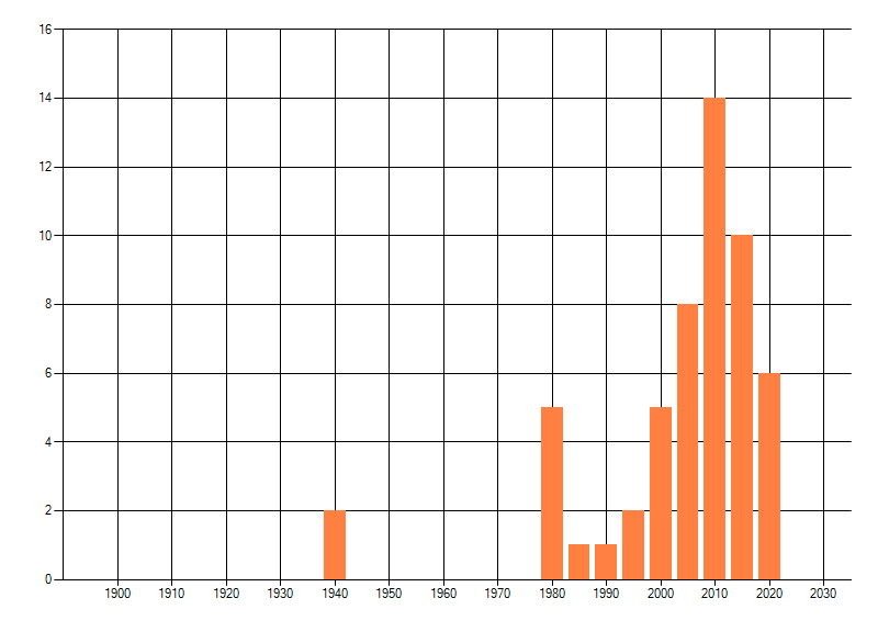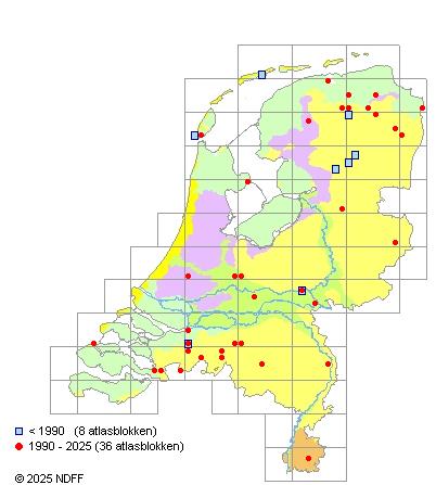 Het aantal atlasblokken (5x5 km) waarin de soort is gemeld binnen een periode van vijf jaar (vanaf 1980) of twintig jaar. Niet gecorrigeerd voor waarnemersinspanning en het aantal doorgegeven waarnemingen kan sterk variëren per periode, dus een trend in verspreiding kan hier niet direct uit worden afgelezen. Het opgegeven jaartal is het eerste jaar van de periode. Bron: gevalideerde waarnemingen uit de NDFF.