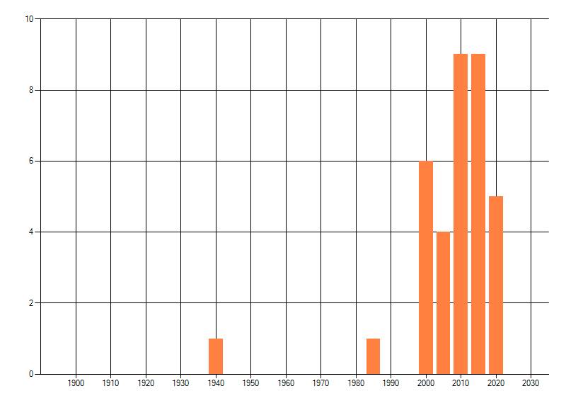 Het aantal atlasblokken (5x5 km) waarin de soort is gemeld binnen een periode van vijf jaar (vanaf 1980) of twintig jaar. Niet gecorrigeerd voor waarnemersinspanning en het aantal doorgegeven waarnemingen kan sterk variëren per periode, dus een trend in verspreiding kan hier niet direct uit worden afgelezen. Het opgegeven jaartal is het eerste jaar van de periode. Bron: gevalideerde waarnemingen uit de NDFF.