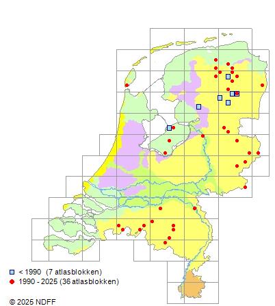 Het aantal atlasblokken (5x5 km) waarin de soort is gemeld binnen een periode van vijf jaar (vanaf 1980) of twintig jaar. Niet gecorrigeerd voor waarnemersinspanning en het aantal doorgegeven waarnemingen kan sterk variëren per periode, dus een trend in verspreiding kan hier niet direct uit worden afgelezen. Het opgegeven jaartal is het eerste jaar van de periode. Bron: gevalideerde waarnemingen uit de NDFF.