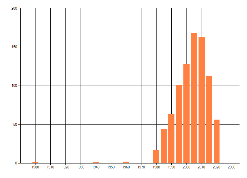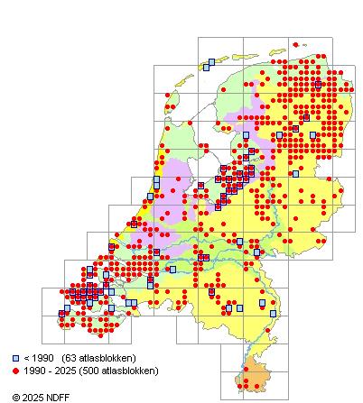 Het aantal atlasblokken (5x5 km) waarin de soort is gemeld binnen een periode van vijf jaar (vanaf 1980) of twintig jaar. Niet gecorrigeerd voor waarnemersinspanning en het aantal doorgegeven waarnemingen kan sterk variëren per periode, dus een trend in verspreiding kan hier niet direct uit worden afgelezen. Het opgegeven jaartal is het eerste jaar van de periode. Bron: gevalideerde waarnemingen uit de NDFF.