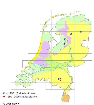 Het aantal atlasblokken (5x5 km) waarin de soort is gemeld binnen een periode van vijf jaar (vanaf 1980) of twintig jaar. Niet gecorrigeerd voor waarnemersinspanning en het aantal doorgegeven waarnemingen kan sterk variëren per periode, dus een trend in verspreiding kan hier niet direct uit worden afgelezen. Het opgegeven jaartal is het eerste jaar van de periode. Bron: gevalideerde waarnemingen uit de NDFF.