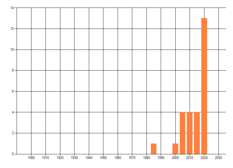 Het aantal atlasblokken (5x5 km) waarin de soort is gemeld binnen een periode van vijf jaar (vanaf 1980) of twintig jaar. Niet gecorrigeerd voor waarnemersinspanning en het aantal doorgegeven waarnemingen kan sterk variëren per periode, dus een trend in verspreiding kan hier niet direct uit worden afgelezen. Het opgegeven jaartal is het eerste jaar van de periode. Bron: gevalideerde waarnemingen uit de NDFF.