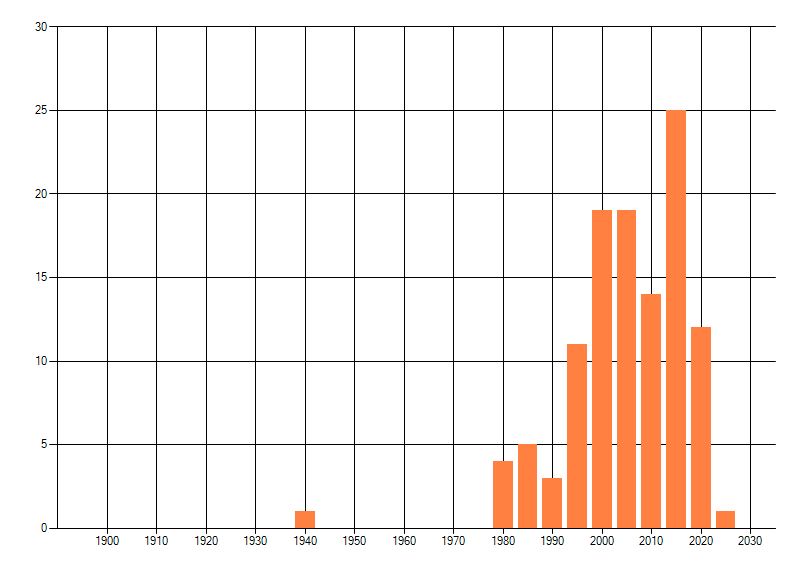 Het aantal atlasblokken (5x5 km) waarin de soort is gemeld binnen een periode van vijf jaar (vanaf 1980) of twintig jaar. Niet gecorrigeerd voor waarnemersinspanning en het aantal doorgegeven waarnemingen kan sterk variëren per periode, dus een trend in verspreiding kan hier niet direct uit worden afgelezen. Het opgegeven jaartal is het eerste jaar van de periode. Bron: gevalideerde waarnemingen uit de NDFF.