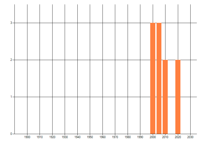 Het aantal atlasblokken (5x5 km) waarin de soort is gemeld binnen een periode van vijf jaar (vanaf 1980) of twintig jaar. Niet gecorrigeerd voor waarnemersinspanning en het aantal doorgegeven waarnemingen kan sterk variëren per periode, dus een trend in verspreiding kan hier niet direct uit worden afgelezen. Het opgegeven jaartal is het eerste jaar van de periode. Bron: gevalideerde waarnemingen uit de NDFF.