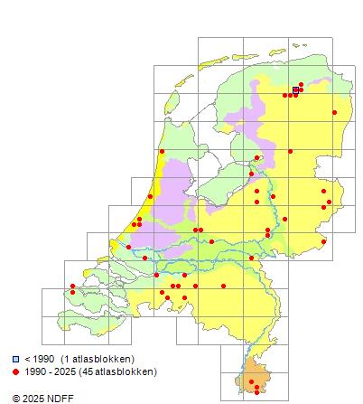Het aantal atlasblokken (5x5 km) waarin de soort is gemeld binnen een periode van vijf jaar (vanaf 1980) of twintig jaar. Niet gecorrigeerd voor waarnemersinspanning en het aantal doorgegeven waarnemingen kan sterk variëren per periode, dus een trend in verspreiding kan hier niet direct uit worden afgelezen. Het opgegeven jaartal is het eerste jaar van de periode. Bron: gevalideerde waarnemingen uit de NDFF.