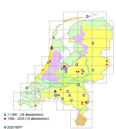 Het aantal atlasblokken (5x5 km) waarin de soort is gemeld binnen een periode van vijf jaar (vanaf 1980) of twintig jaar. Niet gecorrigeerd voor waarnemersinspanning en het aantal doorgegeven waarnemingen kan sterk variëren per periode, dus een trend in verspreiding kan hier niet direct uit worden afgelezen. Het opgegeven jaartal is het eerste jaar van de periode. Bron: gevalideerde waarnemingen uit de NDFF.