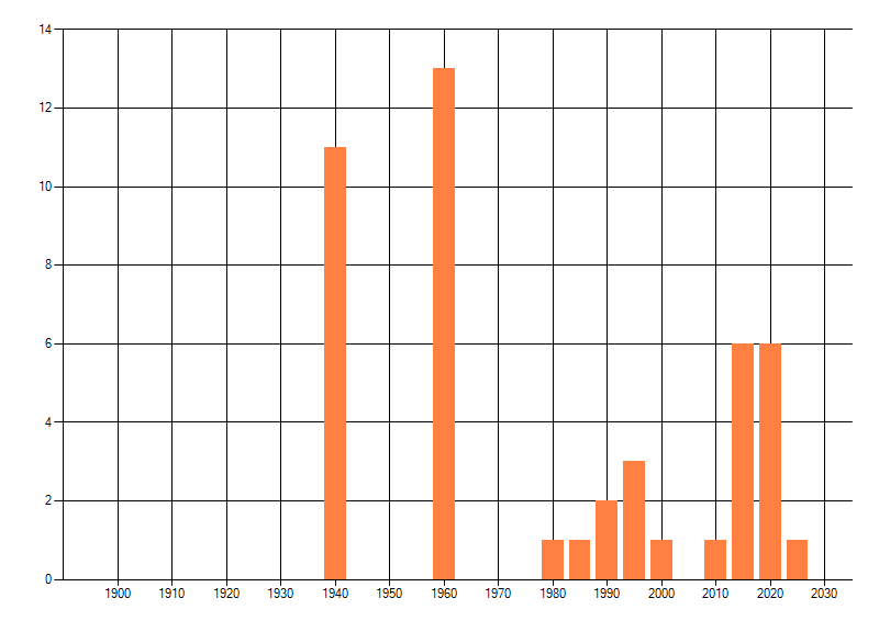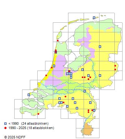 Het aantal atlasblokken (5x5 km) waarin de soort is gemeld binnen een periode van vijf jaar (vanaf 1980) of twintig jaar. Niet gecorrigeerd voor waarnemersinspanning en het aantal doorgegeven waarnemingen kan sterk variëren per periode, dus een trend in verspreiding kan hier niet direct uit worden afgelezen. Het opgegeven jaartal is het eerste jaar van de periode. Bron: gevalideerde waarnemingen uit de NDFF.