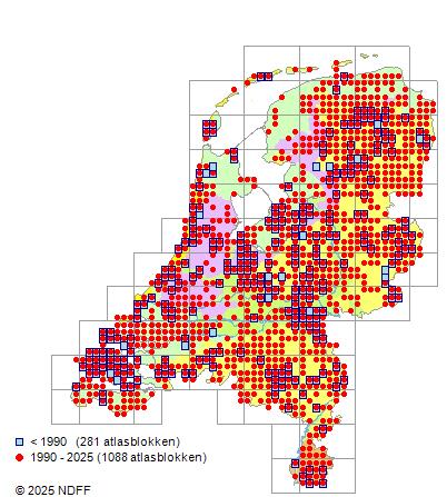 Het aantal atlasblokken (5x5 km) waarin de soort is gemeld binnen een periode van vijf jaar (vanaf 1980) of twintig jaar. Niet gecorrigeerd voor waarnemersinspanning en het aantal doorgegeven waarnemingen kan sterk variëren per periode, dus een trend in verspreiding kan hier niet direct uit worden afgelezen. Het opgegeven jaartal is het eerste jaar van de periode. Bron: gevalideerde waarnemingen uit de NDFF.