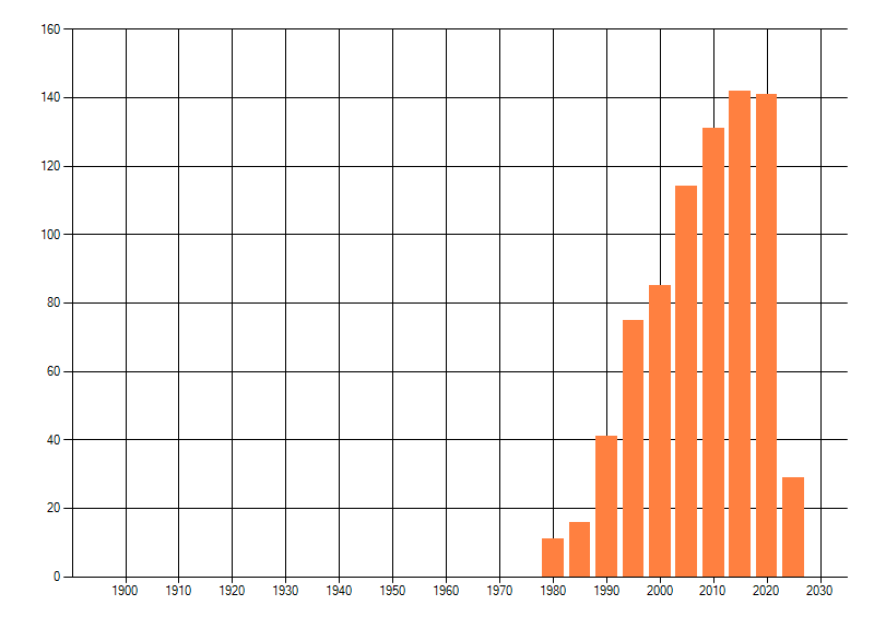 Het aantal atlasblokken (5x5 km) waarin de soort is gemeld binnen een periode van vijf jaar (vanaf 1980) of twintig jaar. Niet gecorrigeerd voor waarnemersinspanning en het aantal doorgegeven waarnemingen kan sterk variëren per periode, dus een trend in verspreiding kan hier niet direct uit worden afgelezen. Het opgegeven jaartal is het eerste jaar van de periode. Bron: gevalideerde waarnemingen uit de NDFF.