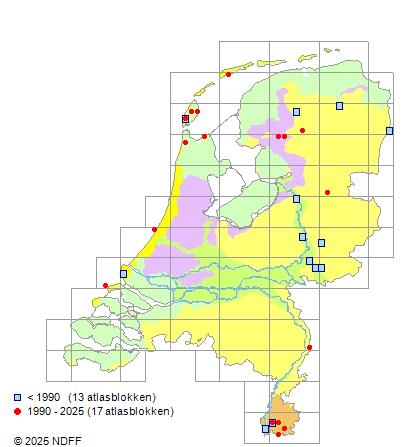 Het aantal atlasblokken (5x5 km) waarin de soort is gemeld binnen een periode van vijf jaar (vanaf 1980) of twintig jaar. Niet gecorrigeerd voor waarnemersinspanning en het aantal doorgegeven waarnemingen kan sterk variëren per periode, dus een trend in verspreiding kan hier niet direct uit worden afgelezen. Het opgegeven jaartal is het eerste jaar van de periode. Bron: gevalideerde waarnemingen uit de NDFF.