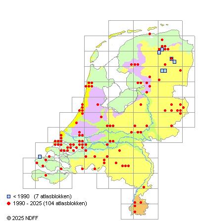 Het aantal atlasblokken (5x5 km) waarin de soort is gemeld binnen een periode van vijf jaar (vanaf 1980) of twintig jaar. Niet gecorrigeerd voor waarnemersinspanning en het aantal doorgegeven waarnemingen kan sterk variëren per periode, dus een trend in verspreiding kan hier niet direct uit worden afgelezen. Het opgegeven jaartal is het eerste jaar van de periode. Bron: gevalideerde waarnemingen uit de NDFF.