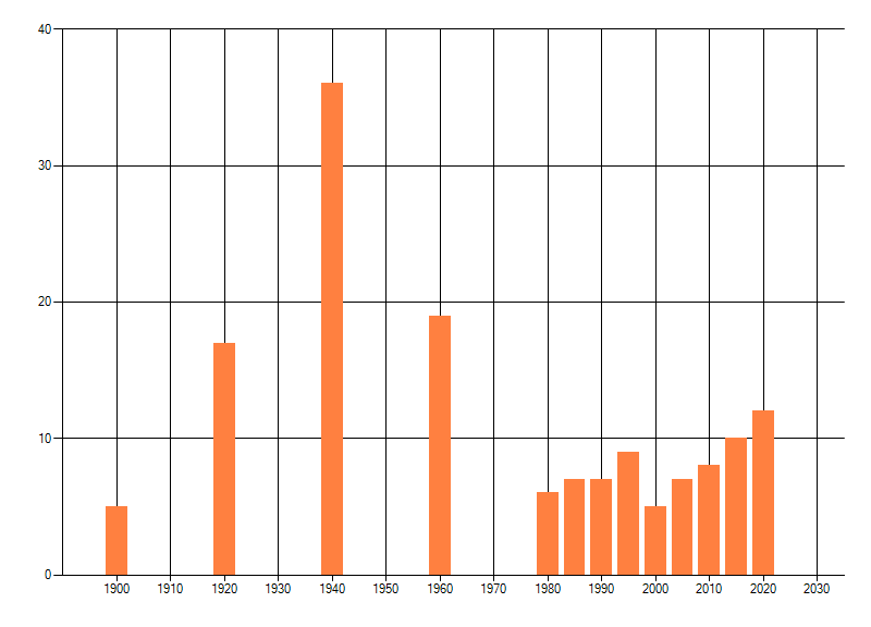 Het aantal atlasblokken (5x5 km) waarin de soort is gemeld binnen een periode van vijf jaar (vanaf 1980) of twintig jaar. Niet gecorrigeerd voor waarnemersinspanning en het aantal doorgegeven waarnemingen kan sterk variëren per periode, dus een trend in verspreiding kan hier niet direct uit worden afgelezen. Het opgegeven jaartal is het eerste jaar van de periode. Bron: gevalideerde waarnemingen uit de NDFF.