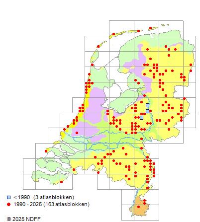 Het aantal atlasblokken (5x5 km) waarin de soort is gemeld binnen een periode van vijf jaar (vanaf 1980) of twintig jaar. Niet gecorrigeerd voor waarnemersinspanning en het aantal doorgegeven waarnemingen kan sterk variƫren per periode, dus een trend in verspreiding kan hier niet direct uit worden afgelezen. Het opgegeven jaartal is het eerste jaar van de periode. Bron: gevalideerde waarnemingen uit de NDFF.