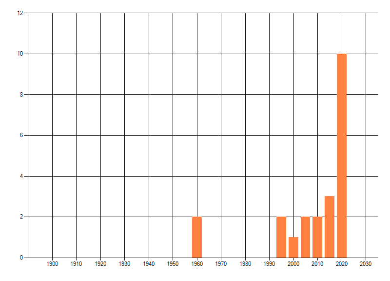 Het aantal atlasblokken (5x5 km) waarin de soort is gemeld binnen een periode van vijf jaar (vanaf 1980) of twintig jaar. Niet gecorrigeerd voor waarnemersinspanning en het aantal doorgegeven waarnemingen kan sterk variëren per periode, dus een trend in verspreiding kan hier niet direct uit worden afgelezen. Het opgegeven jaartal is het eerste jaar van de periode. Bron: gevalideerde waarnemingen uit de NDFF.