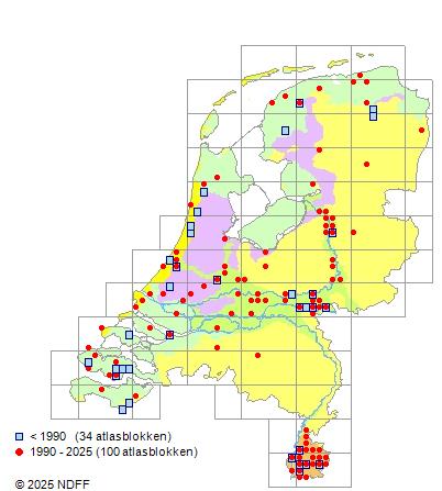 Het aantal atlasblokken (5x5 km) waarin de soort is gemeld binnen een periode van vijf jaar (vanaf 1980) of twintig jaar. Niet gecorrigeerd voor waarnemersinspanning en het aantal doorgegeven waarnemingen kan sterk variëren per periode, dus een trend in verspreiding kan hier niet direct uit worden afgelezen. Het opgegeven jaartal is het eerste jaar van de periode. Bron: gevalideerde waarnemingen uit de NDFF.