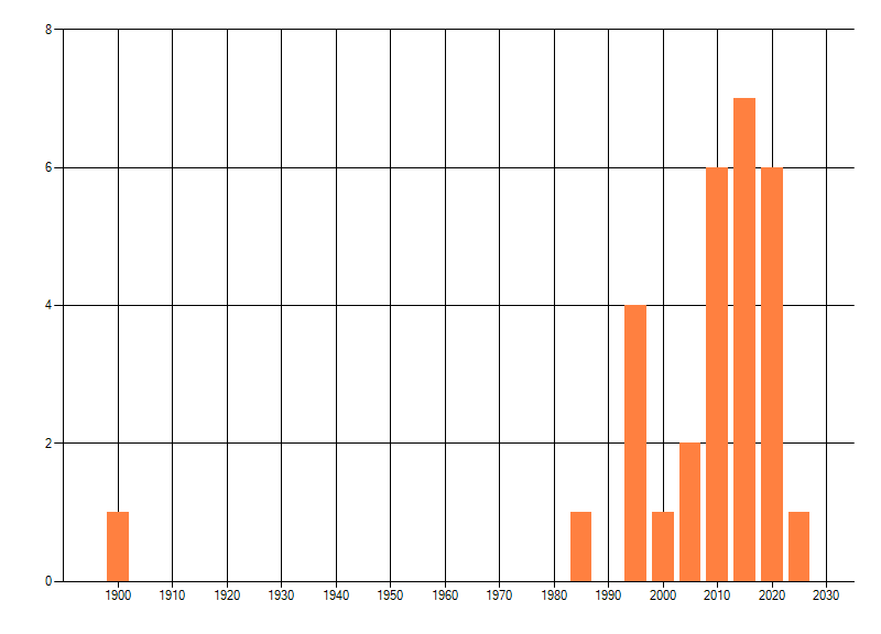 Het aantal atlasblokken (5x5 km) waarin de soort is gemeld binnen een periode van vijf jaar (vanaf 1980) of twintig jaar. Niet gecorrigeerd voor waarnemersinspanning en het aantal doorgegeven waarnemingen kan sterk variëren per periode, dus een trend in verspreiding kan hier niet direct uit worden afgelezen. Het opgegeven jaartal is het eerste jaar van de periode. Bron: gevalideerde waarnemingen uit de NDFF.
