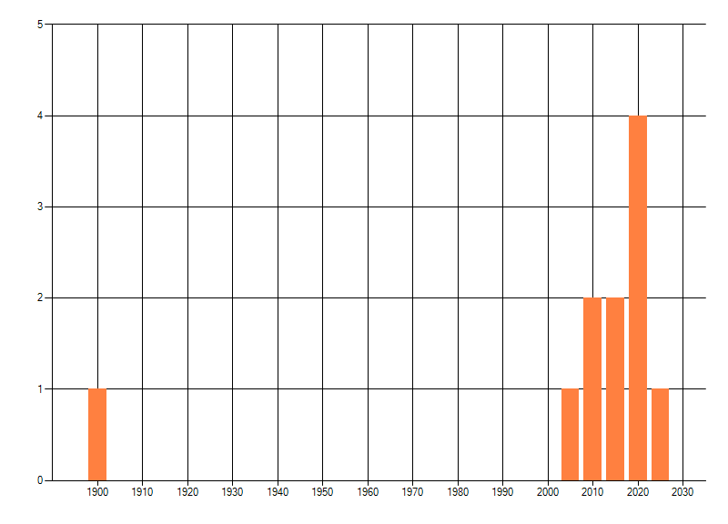 Het aantal atlasblokken (5x5 km) waarin de soort is gemeld binnen een periode van vijf jaar (vanaf 1980) of twintig jaar. Niet gecorrigeerd voor waarnemersinspanning en het aantal doorgegeven waarnemingen kan sterk variëren per periode, dus een trend in verspreiding kan hier niet direct uit worden afgelezen. Het opgegeven jaartal is het eerste jaar van de periode. Bron: gevalideerde waarnemingen uit de NDFF.