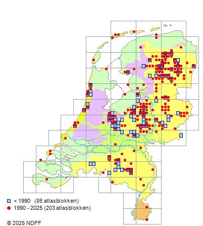 Het aantal atlasblokken (5x5 km) waarin de soort is gemeld binnen een periode van vijf jaar (vanaf 1980) of twintig jaar. Niet gecorrigeerd voor waarnemersinspanning en het aantal doorgegeven waarnemingen kan sterk variëren per periode, dus een trend in verspreiding kan hier niet direct uit worden afgelezen. Het opgegeven jaartal is het eerste jaar van de periode. Bron: gevalideerde waarnemingen uit de NDFF.