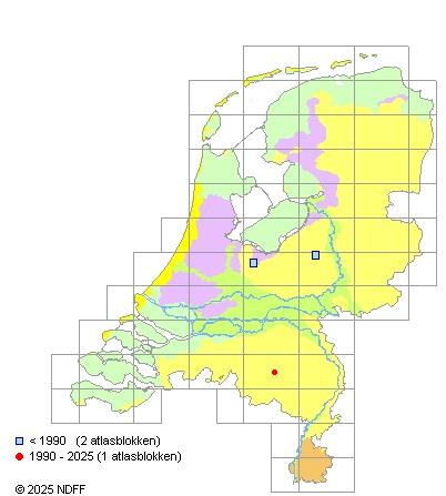 Het aantal atlasblokken (5x5 km) waarin de soort is gemeld binnen een periode van vijf jaar (vanaf 1980) of twintig jaar. Niet gecorrigeerd voor waarnemersinspanning en het aantal doorgegeven waarnemingen kan sterk variëren per periode, dus een trend in verspreiding kan hier niet direct uit worden afgelezen. Het opgegeven jaartal is het eerste jaar van de periode. Bron: gevalideerde waarnemingen uit de NDFF.