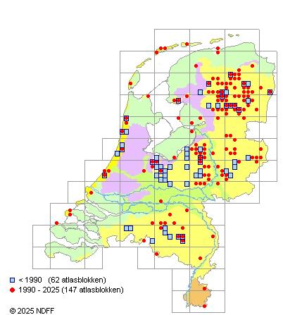 Volgens bestand NMV vóór 1970 matig alg., vooral in P, in werkelijkheid vermoedelijk alg., sterk afgenomen en nu vrij zeld. Kaart in Nauta & Vellinga, Atlas. 1995.