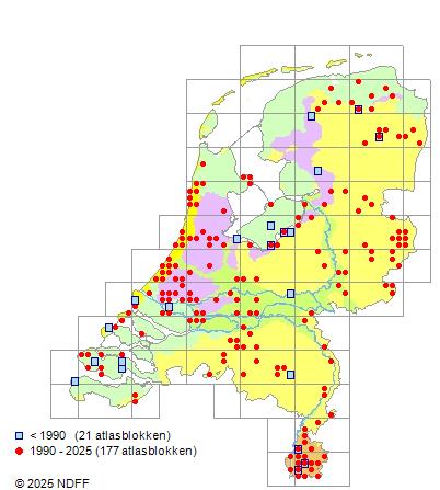 Het aantal atlasblokken (5x5 km) waarin de soort is gemeld binnen een periode van vijf jaar (vanaf 1980) of twintig jaar. Niet gecorrigeerd voor waarnemersinspanning en het aantal doorgegeven waarnemingen kan sterk variëren per periode, dus een trend in verspreiding kan hier niet direct uit worden afgelezen. Het opgegeven jaartal is het eerste jaar van de periode. Bron: gevalideerde waarnemingen uit de NDFF.