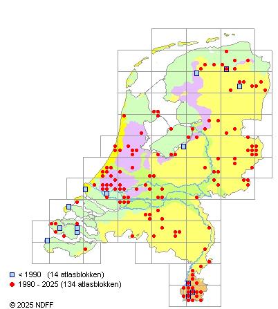 Het aantal atlasblokken (5x5 km) waarin de soort is gemeld binnen een periode van vijf jaar (vanaf 1980) of twintig jaar. Niet gecorrigeerd voor waarnemersinspanning en het aantal doorgegeven waarnemingen kan sterk variëren per periode, dus een trend in verspreiding kan hier niet direct uit worden afgelezen. Het opgegeven jaartal is het eerste jaar van de periode. Bron: gevalideerde waarnemingen uit de NDFF.