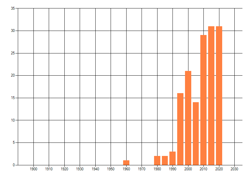 Het aantal atlasblokken (5x5 km) waarin de soort is gemeld binnen een periode van vijf jaar (vanaf 1980) of twintig jaar. Niet gecorrigeerd voor waarnemersinspanning en het aantal doorgegeven waarnemingen kan sterk variëren per periode, dus een trend in verspreiding kan hier niet direct uit worden afgelezen. Het opgegeven jaartal is het eerste jaar van de periode. Bron: gevalideerde waarnemingen uit de NDFF.