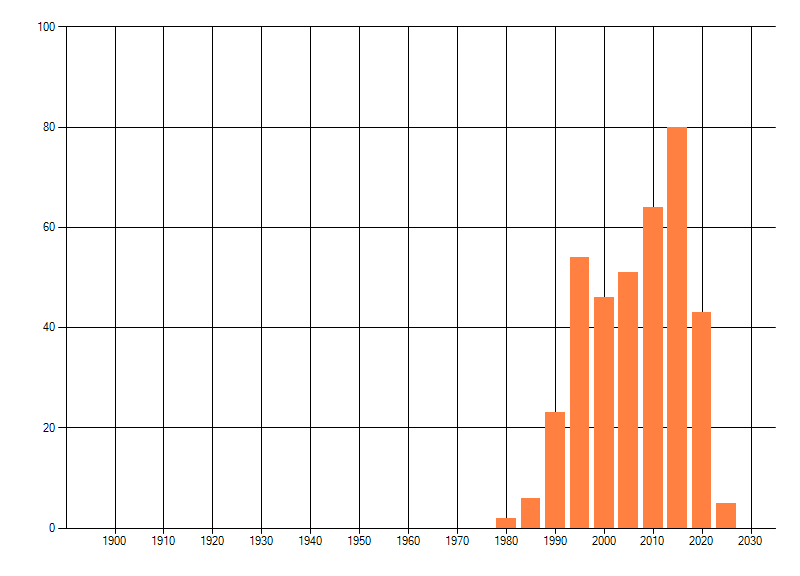 Het aantal atlasblokken (5x5 km) waarin de soort is gemeld binnen een periode van vijf jaar (vanaf 1980) of twintig jaar. Niet gecorrigeerd voor waarnemersinspanning en het aantal doorgegeven waarnemingen kan sterk variëren per periode, dus een trend in verspreiding kan hier niet direct uit worden afgelezen. Het opgegeven jaartal is het eerste jaar van de periode. Bron: gevalideerde waarnemingen uit de NDFF.