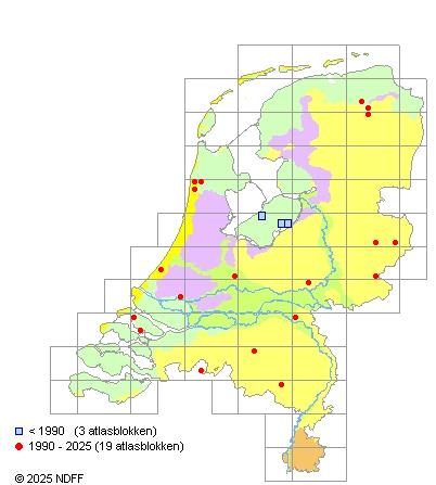 Het aantal atlasblokken (5x5 km) waarin de soort is gemeld binnen een periode van vijf jaar (vanaf 1980) of twintig jaar. Niet gecorrigeerd voor waarnemersinspanning en het aantal doorgegeven waarnemingen kan sterk variëren per periode, dus een trend in verspreiding kan hier niet direct uit worden afgelezen. Het opgegeven jaartal is het eerste jaar van de periode. Bron: gevalideerde waarnemingen uit de NDFF.