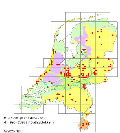 Het aantal atlasblokken (5x5 km) waarin de soort is gemeld binnen een periode van vijf jaar (vanaf 1980) of twintig jaar. Niet gecorrigeerd voor waarnemersinspanning en het aantal doorgegeven waarnemingen kan sterk variëren per periode, dus een trend in verspreiding kan hier niet direct uit worden afgelezen. Het opgegeven jaartal is het eerste jaar van de periode. Bron: gevalideerde waarnemingen uit de NDFF.