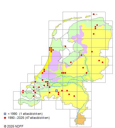 Het aantal atlasblokken (5x5 km) waarin de soort is gemeld binnen een periode van vijf jaar (vanaf 1980) of twintig jaar. Niet gecorrigeerd voor waarnemersinspanning en het aantal doorgegeven waarnemingen kan sterk variëren per periode, dus een trend in verspreiding kan hier niet direct uit worden afgelezen. Het opgegeven jaartal is het eerste jaar van de periode. Bron: gevalideerde waarnemingen uit de NDFF.