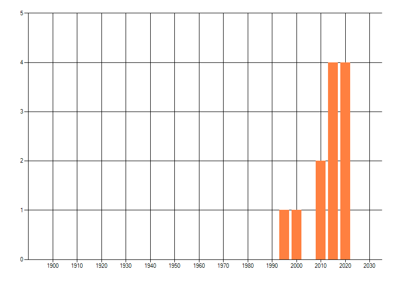 Het aantal atlasblokken (5x5 km) waarin de soort is gemeld binnen een periode van vijf jaar (vanaf 1980) of twintig jaar. Niet gecorrigeerd voor waarnemersinspanning en het aantal doorgegeven waarnemingen kan sterk variëren per periode, dus een trend in verspreiding kan hier niet direct uit worden afgelezen. Het opgegeven jaartal is het eerste jaar van de periode. Bron: gevalideerde waarnemingen uit de NDFF.