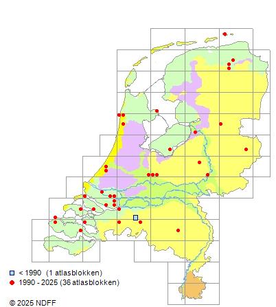 Het aantal atlasblokken (5x5 km) waarin de soort is gemeld binnen een periode van vijf jaar (vanaf 1980) of twintig jaar. Niet gecorrigeerd voor waarnemersinspanning en het aantal doorgegeven waarnemingen kan sterk variëren per periode, dus een trend in verspreiding kan hier niet direct uit worden afgelezen. Het opgegeven jaartal is het eerste jaar van de periode. Bron: gevalideerde waarnemingen uit de NDFF.