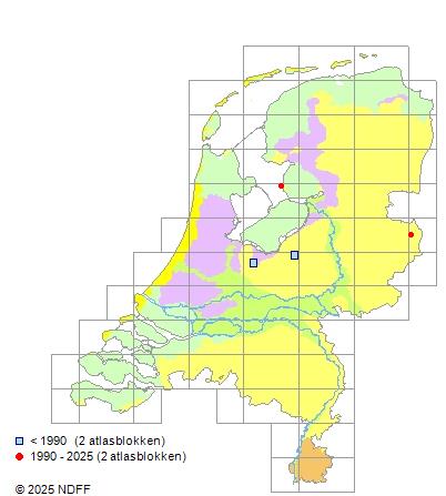 Het aantal atlasblokken (5x5 km) waarin de soort is gemeld binnen een periode van vijf jaar (vanaf 1980) of twintig jaar. Niet gecorrigeerd voor waarnemersinspanning en het aantal doorgegeven waarnemingen kan sterk variëren per periode, dus een trend in verspreiding kan hier niet direct uit worden afgelezen. Het opgegeven jaartal is het eerste jaar van de periode. Bron: gevalideerde waarnemingen uit de NDFF.
