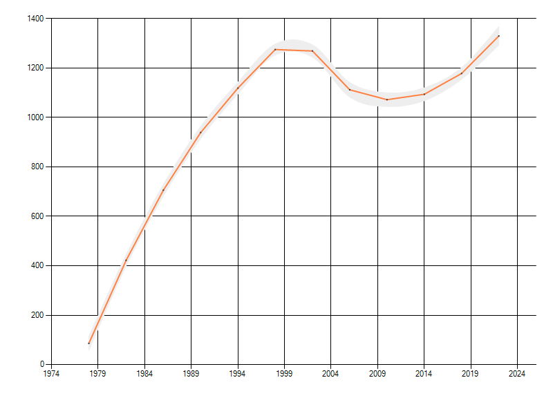 In de grafiek correspondeert ieder punt met het laatste jaar van zo'n periode.