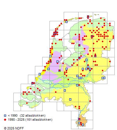 Het aantal atlasblokken (5x5 km) waarin de soort is gemeld binnen een periode van vijf jaar (vanaf 1980) of twintig jaar. Niet gecorrigeerd voor waarnemersinspanning en het aantal doorgegeven waarnemingen kan sterk variëren per periode, dus een trend in verspreiding kan hier niet direct uit worden afgelezen. Het opgegeven jaartal is het eerste jaar van de periode. Bron: gevalideerde waarnemingen uit de NDFF.