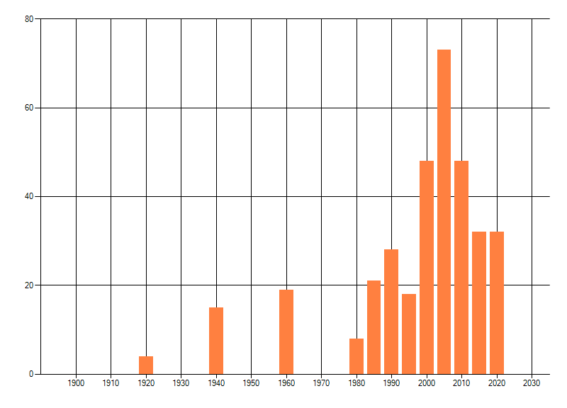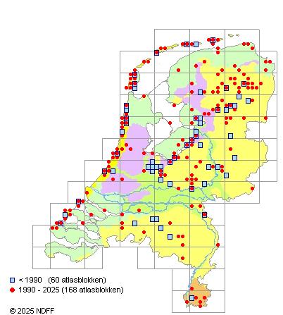 Het aantal atlasblokken (5x5 km) waarin de soort is gemeld binnen een periode van vijf jaar (vanaf 1980) of twintig jaar. Niet gecorrigeerd voor waarnemersinspanning en het aantal doorgegeven waarnemingen kan sterk variëren per periode, dus een trend in verspreiding kan hier niet direct uit worden afgelezen. Het opgegeven jaartal is het eerste jaar van de periode. Bron: gevalideerde waarnemingen uit de NDFF.