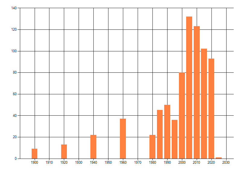 Het aantal atlasblokken (5x5 km) waarin de soort is gemeld binnen een periode van vijf jaar (vanaf 1980) of twintig jaar. Niet gecorrigeerd voor waarnemersinspanning en het aantal doorgegeven waarnemingen kan sterk variëren per periode, dus een trend in verspreiding kan hier niet direct uit worden afgelezen. Het opgegeven jaartal is het eerste jaar van de periode. Bron: gevalideerde waarnemingen uit de NDFF.