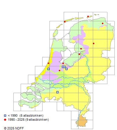 Het aantal atlasblokken (5x5 km) waarin de soort is gemeld binnen een periode van vijf jaar (vanaf 1980) of twintig jaar. Niet gecorrigeerd voor waarnemersinspanning en het aantal doorgegeven waarnemingen kan sterk variëren per periode, dus een trend in verspreiding kan hier niet direct uit worden afgelezen. Het opgegeven jaartal is het eerste jaar van de periode. Bron: gevalideerde waarnemingen uit de NDFF.