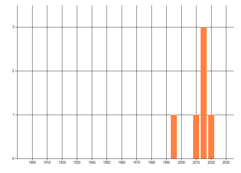 Het aantal atlasblokken (5x5 km) waarin de soort is gemeld binnen een periode van vijf jaar (vanaf 1980) of twintig jaar. Niet gecorrigeerd voor waarnemersinspanning en het aantal doorgegeven waarnemingen kan sterk variëren per periode, dus een trend in verspreiding kan hier niet direct uit worden afgelezen. Het opgegeven jaartal is het eerste jaar van de periode. Bron: gevalideerde waarnemingen uit de NDFF.