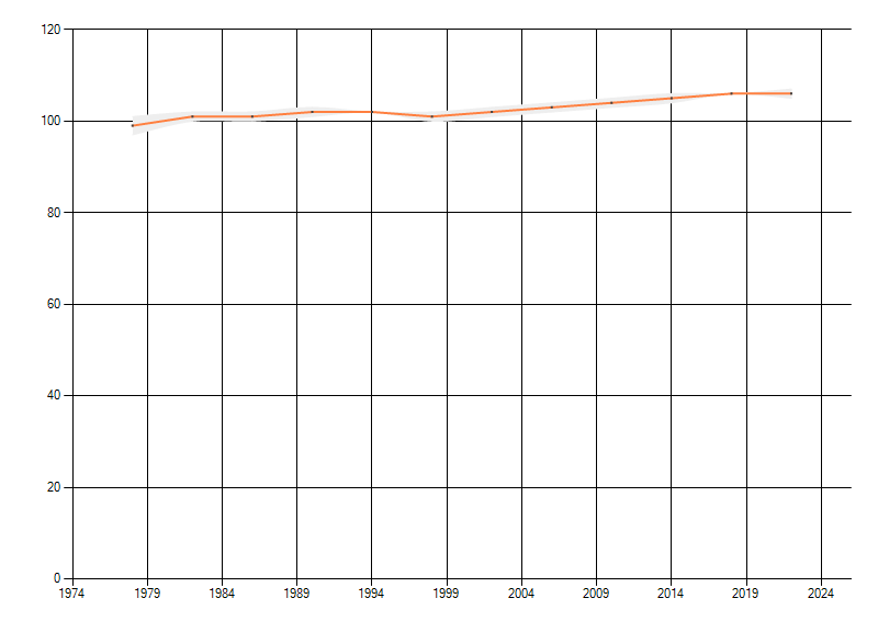 Gemiddelde trend van het aantal kilometerhokken waarin de soort voorkomt, weergegeven als indexcijfer (1975-1978 = 100). De trend is gecorrigeerd voor waarnemersinspanning en geeft de relatieve verandering in het aantal bezette kilometerhokken weer. Voor de berekening worden de data per periode van vier jaar samengenomen. In de grafiek correspondeert ieder punt met het laatste jaar van zo'n periode.