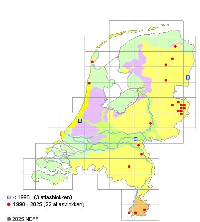 Het aantal atlasblokken (5x5 km) waarin de soort is gemeld binnen een periode van vijf jaar (vanaf 1980) of twintig jaar. Niet gecorrigeerd voor waarnemersinspanning en het aantal doorgegeven waarnemingen kan sterk variƫren per periode, dus een trend in verspreiding kan hier niet direct uit worden afgelezen. Het opgegeven jaartal is het eerste jaar van de periode. Bron: gevalideerde waarnemingen uit de NDFF.