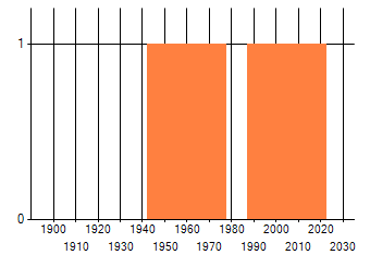 Het aantal atlasblokken (5x5 km) waarin de soort is gemeld binnen een periode van vijf jaar (vanaf 1980) of twintig jaar. Niet gecorrigeerd voor waarnemersinspanning en het aantal doorgegeven waarnemingen kan sterk variëren per periode, dus een trend in verspreiding kan hier niet direct uit worden afgelezen. Het opgegeven jaartal is het eerste jaar van de periode. Bron: gevalideerde waarnemingen uit de NDFF.
