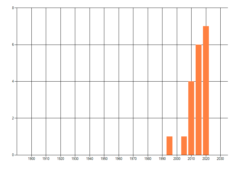 Het aantal atlasblokken (5x5 km) waarin de soort is gemeld binnen een periode van vijf jaar (vanaf 1980) of twintig jaar. Niet gecorrigeerd voor waarnemersinspanning en het aantal doorgegeven waarnemingen kan sterk variëren per periode, dus een trend in verspreiding kan hier niet direct uit worden afgelezen. Het opgegeven jaartal is het eerste jaar van de periode. Bron: gevalideerde waarnemingen uit de NDFF.