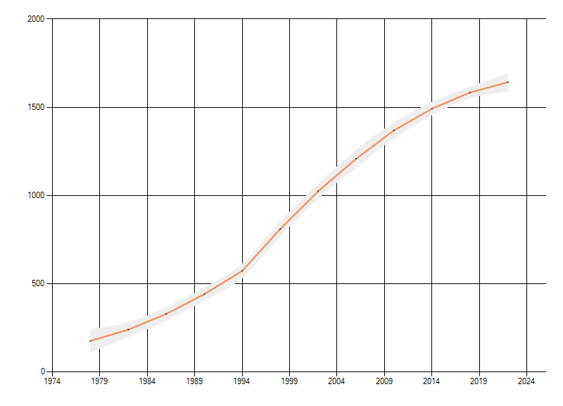 Gemiddelde trend van het aantal kilometerhokken waarin de soort voorkomt, weergegeven als indexcijfer (1975-1978 = 100). De trend is gecorrigeerd voor waarnemersinspanning en geeft de relatieve verandering in het aantal bezette kilometerhokken weer. Voor de berekening worden de data per periode van vier jaar samengenomen. In de grafiek correspondeert ieder punt met het laatste jaar van zo'n periode.