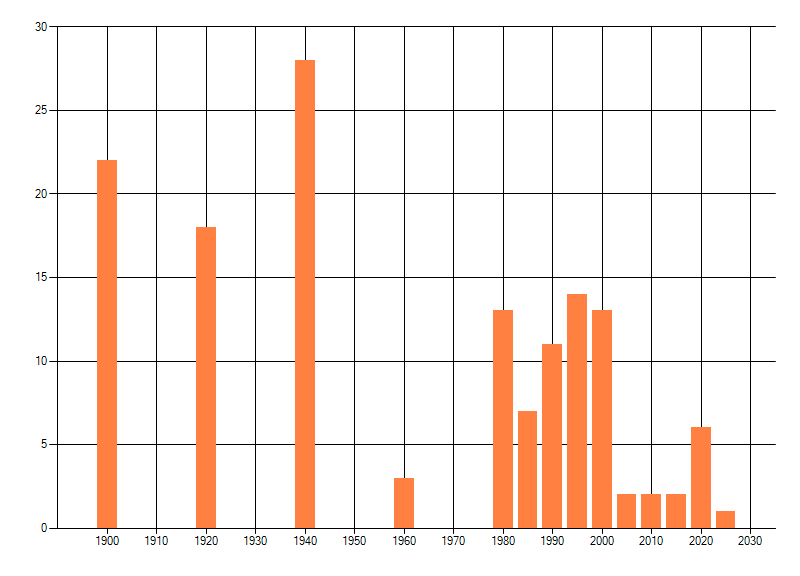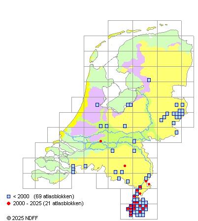 Het aantal atlasblokken (5x5 km) waarin de soort is gemeld binnen een periode van vijf jaar (vanaf 1980) of twintig jaar. Niet gecorrigeerd voor waarnemersinspanning en het aantal doorgegeven waarnemingen kan sterk variëren per periode, dus een trend in verspreiding kan hier niet direct uit worden afgelezen. Het opgegeven jaartal is het eerste jaar van de periode. Bron: gevalideerde waarnemingen uit de NDFF.