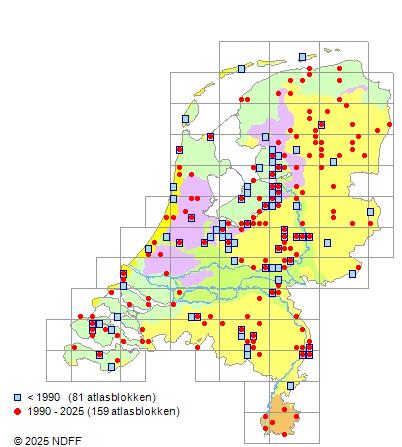 Het aantal atlasblokken (5x5 km) waarin de soort is gemeld binnen een periode van vijf jaar (vanaf 1980) of twintig jaar. Niet gecorrigeerd voor waarnemersinspanning en het aantal doorgegeven waarnemingen kan sterk variëren per periode, dus een trend in verspreiding kan hier niet direct uit worden afgelezen. Het opgegeven jaartal is het eerste jaar van de periode. Bron: gevalideerde waarnemingen uit de NDFF.
