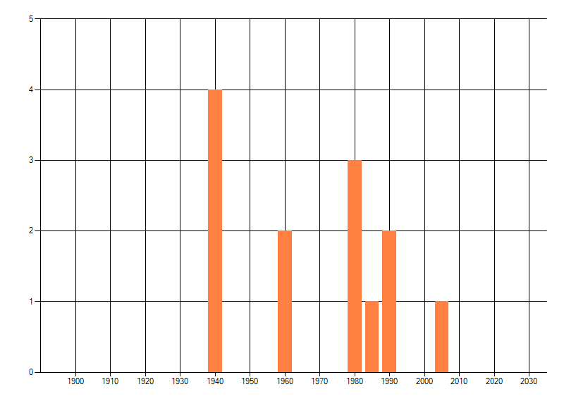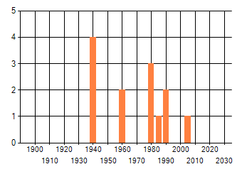 Het aantal atlasblokken (5x5 km) waarin de soort is gemeld binnen een periode van vijf jaar (vanaf 1980) of twintig jaar. Niet gecorrigeerd voor waarnemersinspanning en het aantal doorgegeven waarnemingen kan sterk variëren per periode, dus een trend in verspreiding kan hier niet direct uit worden afgelezen. Het opgegeven jaartal is het eerste jaar van de periode. Bron: gevalideerde waarnemingen uit de NDFF.